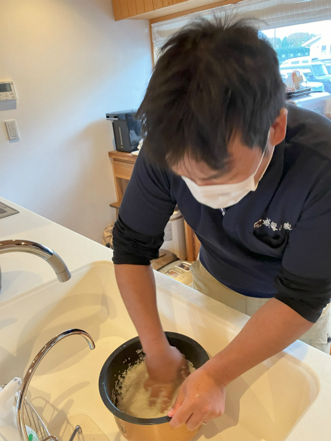 お米研ぎもお手の物! 手際よく一升6合のお米を研いでいきます。