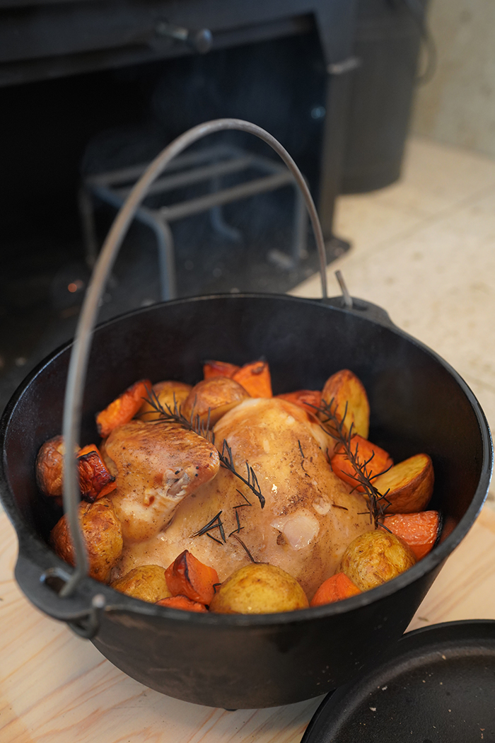 鶏の丸焼きを準備している間に、薪ストーブの炎が落ち着いてくるのを待ちます。