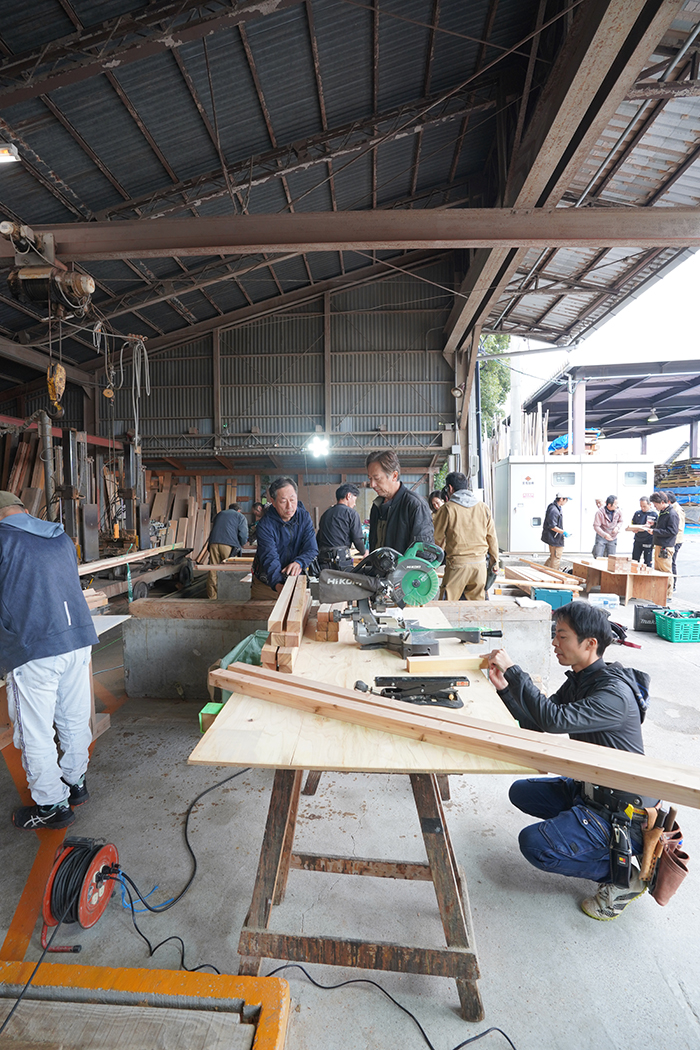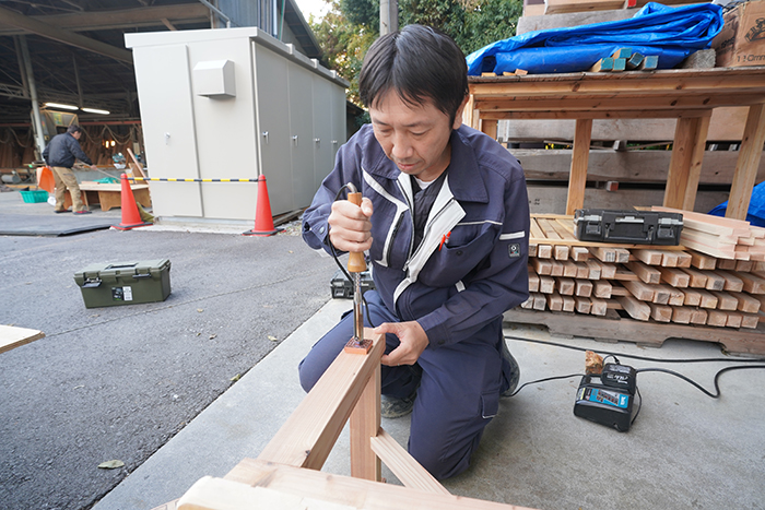 ①部材制作では、図面を確認しながら大工さんたちが材料を寸法通りにカット。