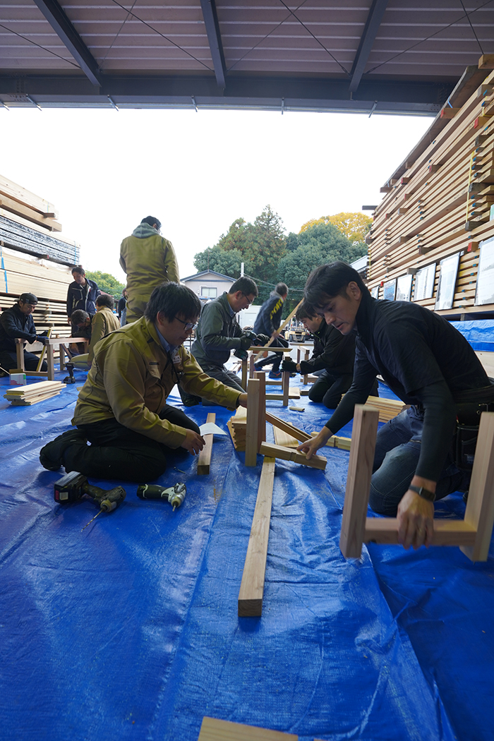 今年は子ども園さんから「小さな子でも座りやすいサイズにしてほしい」とリクエストをいただき、大・中・小の3サイズのベンチとテーブルを作ることに。匠の会メンバー約20名と弊社スタッフが力を合わせて取り組みました。