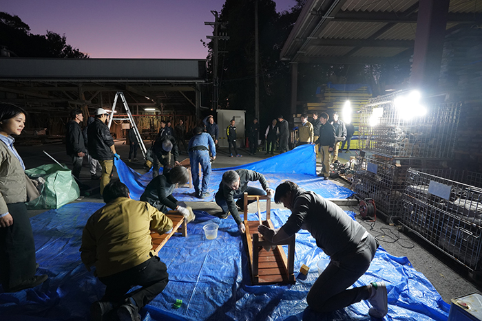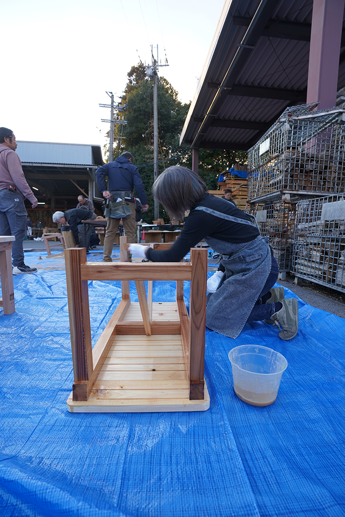 さぁ最終工程④塗装です!ベンチ等は屋外で使われるため、自然塗料を使って丁寧に塗装。裏側までしっかり塗られ、匠の技が光ります。