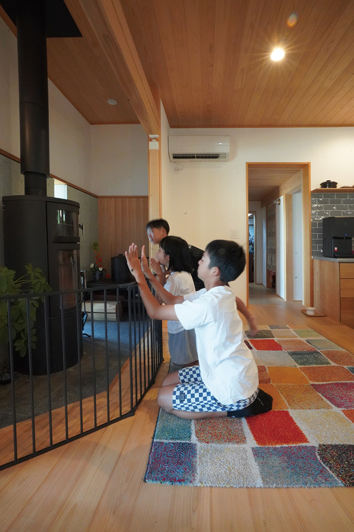 お気に入りの場所のひとつが「薪ストーブ前」ということで、取材の日はまだ暑い時期だったのですが、ストーブにあたる様子を再現してくださるひと幕も。