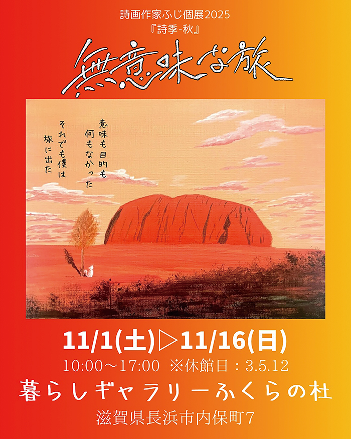 地域の方イベント情報として、111日(土)~16日(日)詩画作家ふじさん個展「詩季・秋~無意味な旅~」が開催されます。
