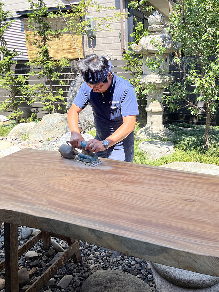 一枚板全体をサンダーでウィ~ンと削ります。