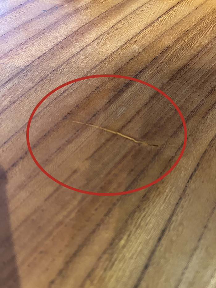木の呼吸と収縮による自然な現象なのですが、「テーブル」として使っているため、拭いた時にちょっと引っかかりがある感じ。