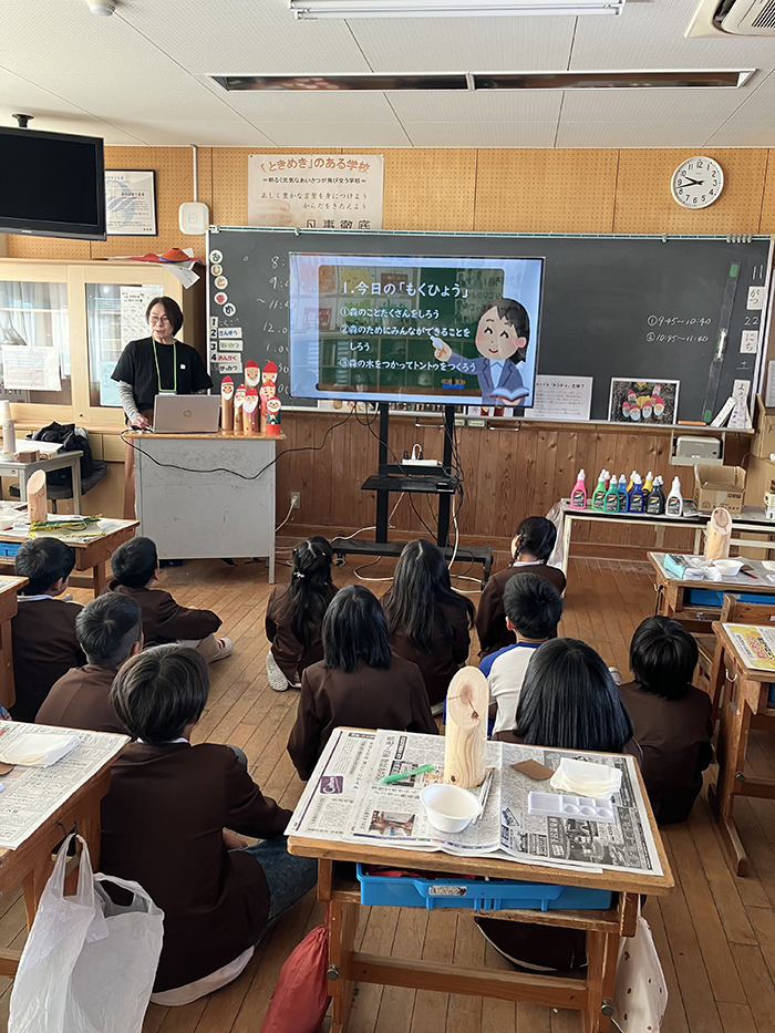 「森のことをたくさん知ろう」のお話では、製材所をもつ工務店として、木や森のことを少しでも身近に感じてもらえたらと思い、森の働きについて○×クイズを交えながらお話しました。