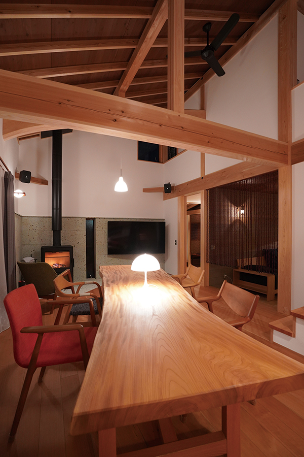 モノづくりが好きなご夫婦の家。二階の子ども部屋は下地までの施工で、これからご家族の手で仕上げていかれます。太陽熱温水器と薪ストーブを取り入れ、自然エネルギーを活かした暮らし。家族とともに育っていく住まいを、ぜひご覧ください。