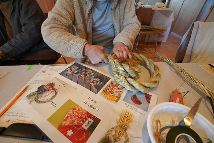 「極太」しめ縄に時間がかかりましたが、お隣の方と協力し合ったりしながら形が決まりました。