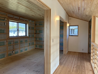 2階の子供室は、お客様が後々壁仕上工事をされるので、断熱材が見えています。セルロースファイバー断熱材がしっかりと充填されているのが確認出来ました。