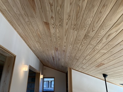 吹抜けの天井です。幅120程の杉板を大工さんが一枚づつ張って下さっているのですが、目透かし(溝)の通りも真っすぐ!ビシィッと揃っています!細部まで丁寧な仕事が伝わってきます。