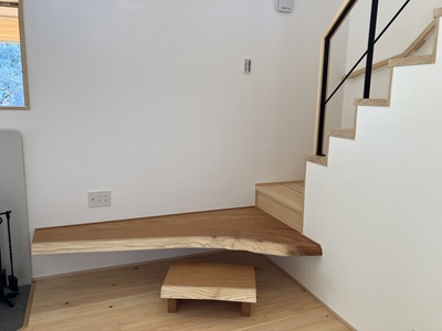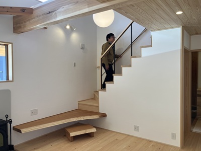 階段の1段目・2段目がケヤキの一枚板を使っています。無垢の一枚板の自然な形が空間に変化を与えてくれています。材木を扱う会社としてこれからもお客様に木の良さ、一枚板の力強さを伝えていこう。と話していました。