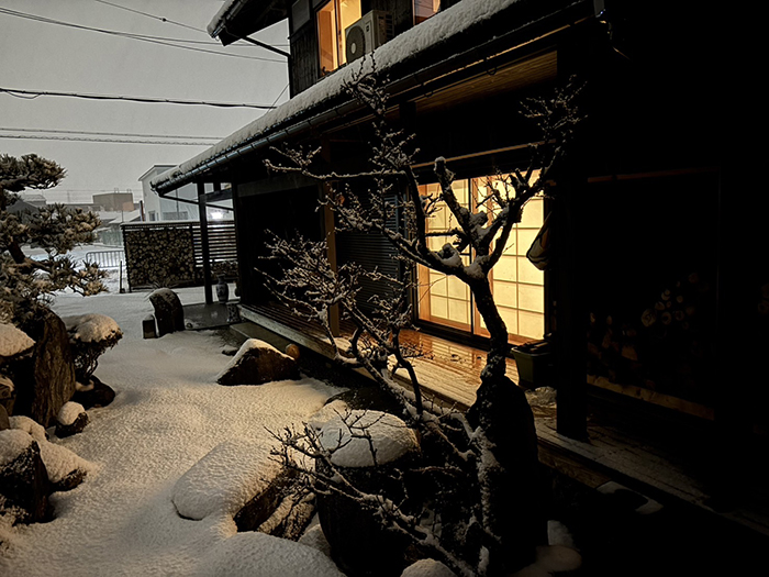 雪に沈む夜、障子の灯りが静かにぬくもりを伝える