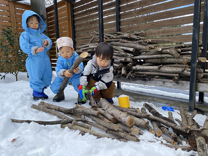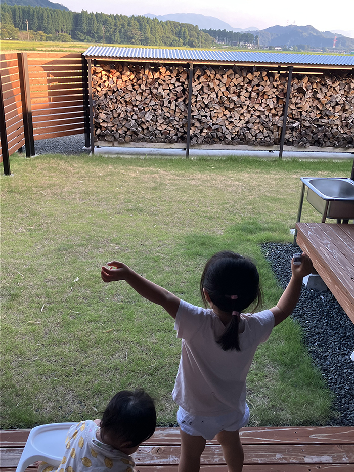 薪を組んで、キャンプファイヤーごっこをしていました。マシュマロを焼いて食べるのが、子どもたち3人の憧れです。