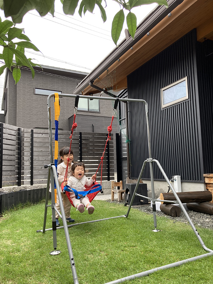 庭でぶらんこ 姉妹で仲良く遊んでいます