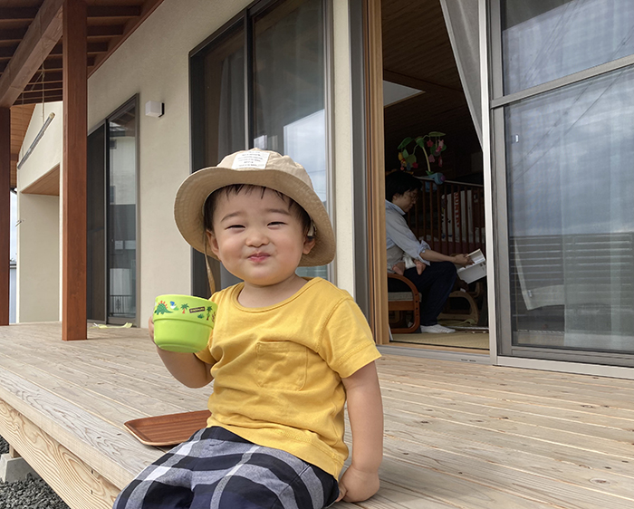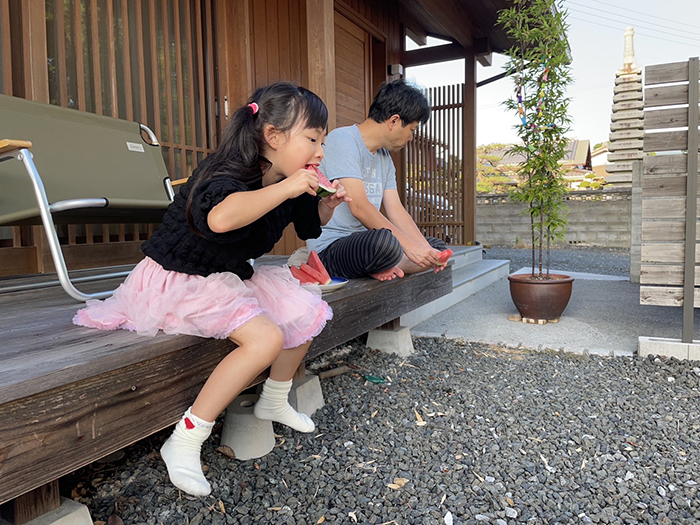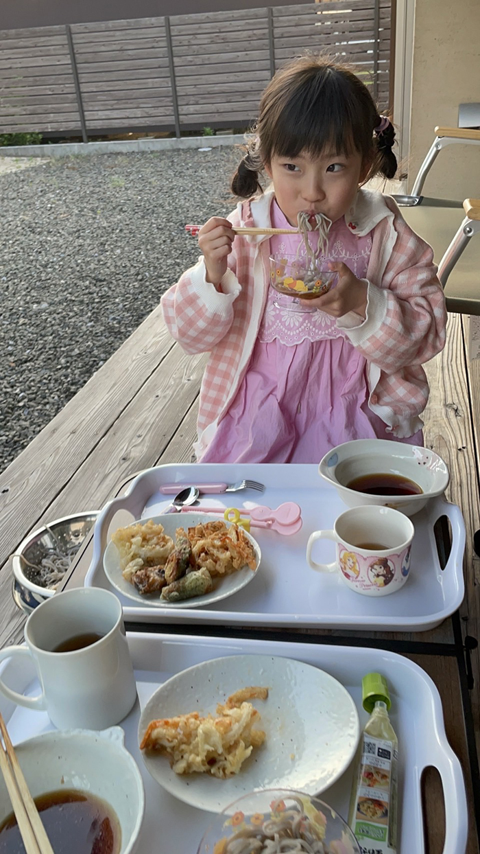 ウッドデッキは我が家の家族時間には必要不可欠。娘は大好物なお蕎麦を口一杯に頬張っています。