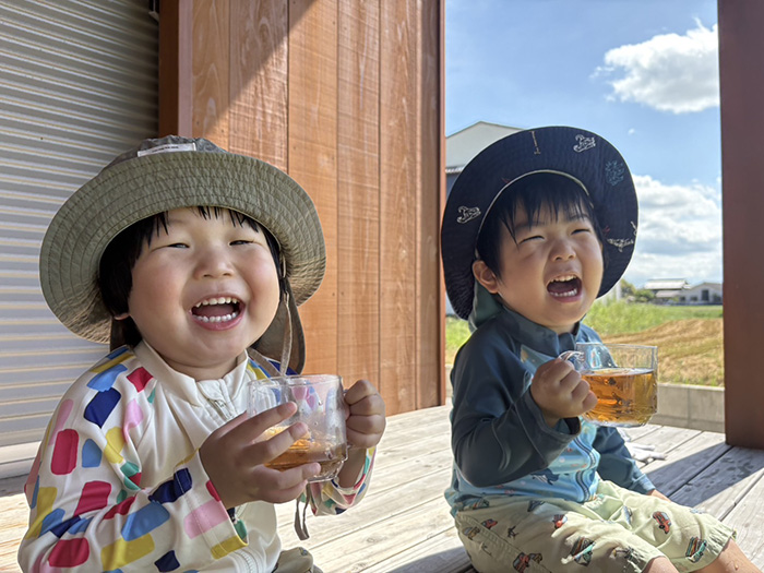一仕事(庭遊び)して汗をかいたあとは、水分補給が大事です。