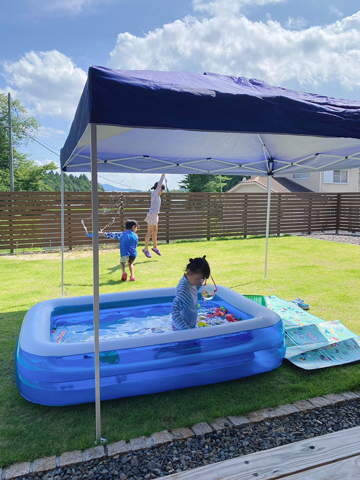 朝一窓を開けて飛び出すウッドデッキ!今日は午後から広い庭でプール遊びを満喫♪今年は熱いからこまめに水分補給して、またプール遊びするでー^ ^