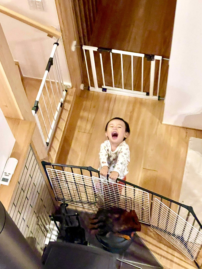 吹き抜けを通して1階の子どもの遊び場がよく見えるので、よく2階からいないいないばあをしています。普段とは異なるいないいないばあができるのもこの家の魅力。思いもよらぬところから顔を出すので、子どもも驚きつつ、大喜びします。