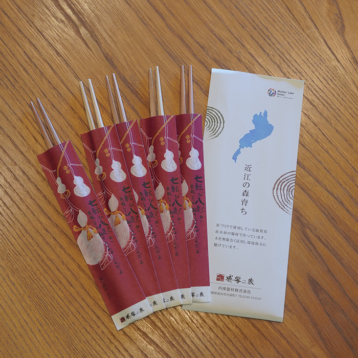 家づくりで使用している滋賀県産の杉の端材で作ったオリジナル近江箸。木を無駄なく活用し、環境保全に繋げています。