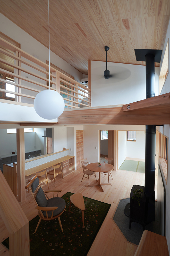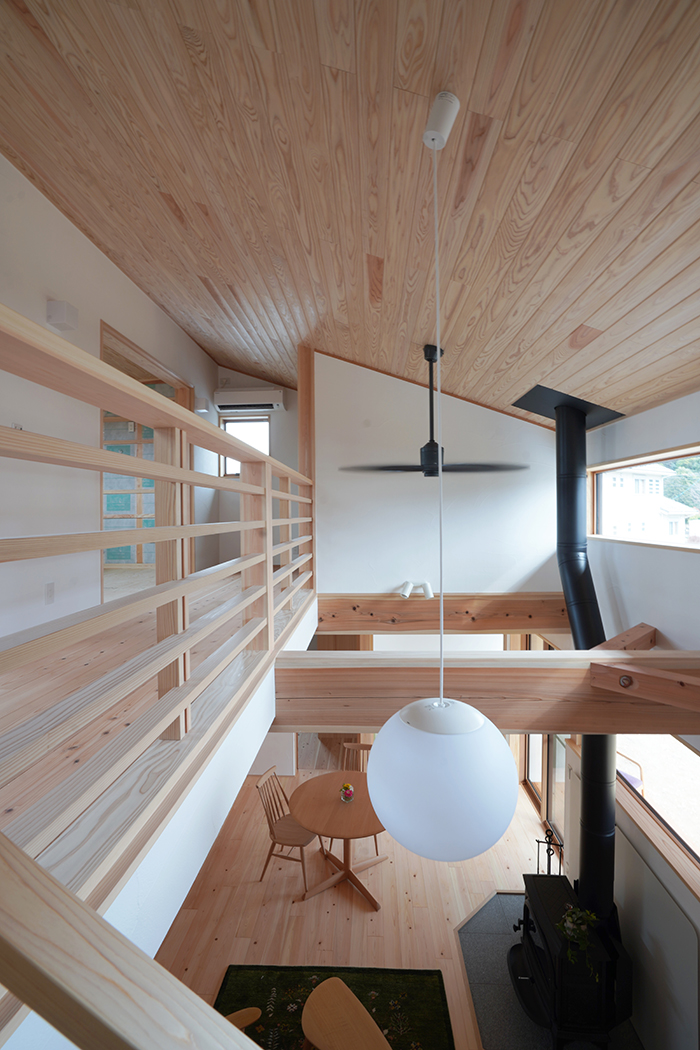 ▼吹き抜けを見下ろすと薪ストーブのあるリビングが見渡せます