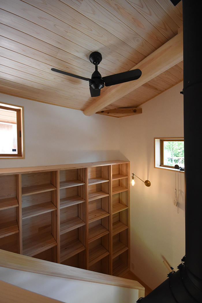 ・階段には壁一面の本棚。図書館のようにお気に入りの本を並べて愉しむことができます。