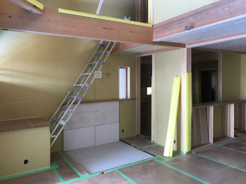 造作と壁下地の施工が終わり、石膏ボード張りがはじまっています。内部大工工事も大詰めです。