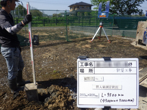 パイル全ての施工深度を確認していきます。オートレベルで確実に貫入量を測定することができます。