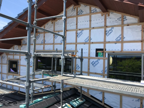 外壁の透湿防水シート張りが完了しました。壁体内の湿気を外に逃がし外部からの雨水の侵入をしっかりと防ぎます。このあと外壁の焼杉板張りをおこないます。