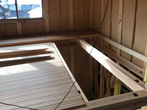 2階スキップフロアでの作業がすすんでいます。下から見上げた時に化粧面が見えるように、羽目板の表面を下にして張っていきます。
