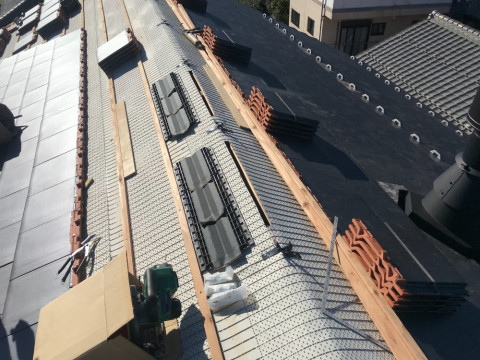 下屋の瓦葺きがすすんでいます。これから壁際の取り合い部を納めていきます。
