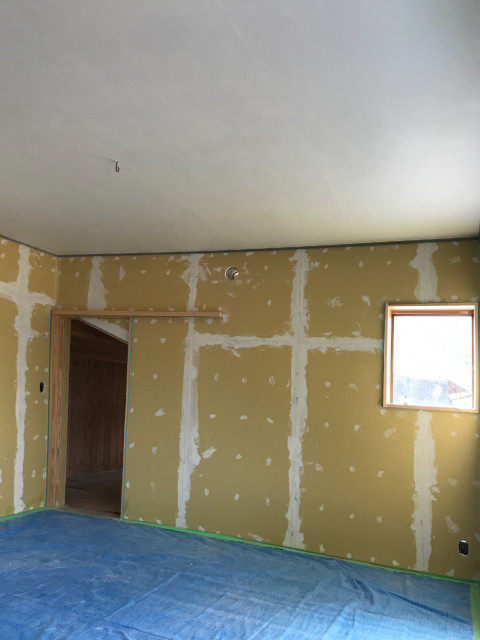 2階から内部左官工事がはじまりました。石膏ボードの継ぎ目へのファイバーテープ貼り、柱など木部への養生と、下塗り前の準備がすすんでいます。