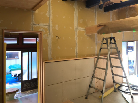 1階の内部左官工事がはじまりました。石膏ボードのビス穴・ジョイント部のパテ処理をおこなっています。