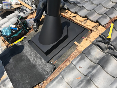 薪ストーブの煙突の取り付けをおこなっています。施工に必要な範囲のみ瓦をめくり、防水処理もしっかりおこないながら取り付けていきます。