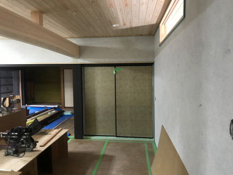母屋2階の作業がすすんでいます。こちらは収納スペースになるので、天井を石膏ボードで仕上げます。