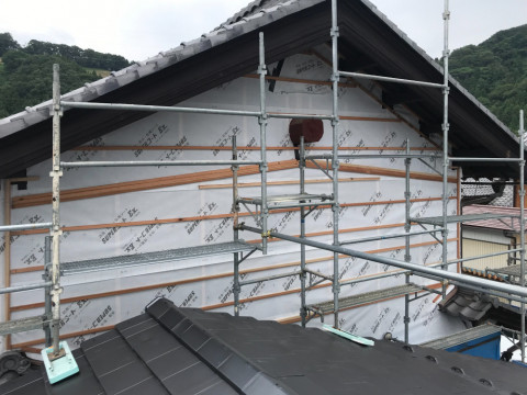 母屋妻面の透湿シート張りと下地の施工をおこないました。