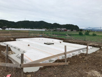 コンクリート打設が完了しました。山や田畑に囲まれた暮らしロケーションを楽しむ暮らしです。