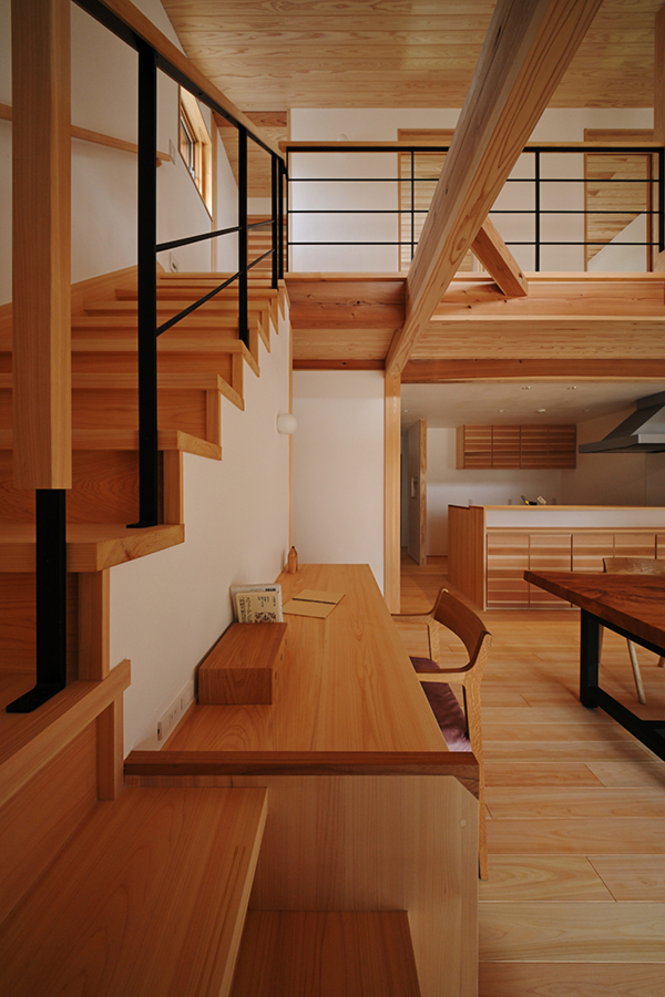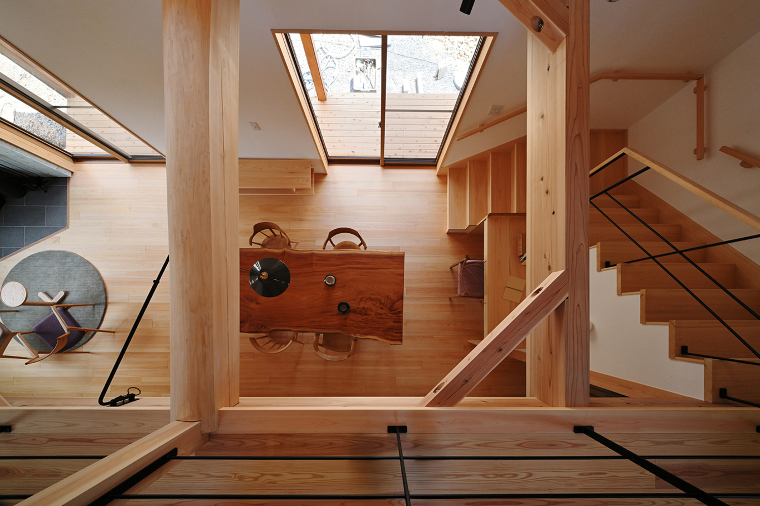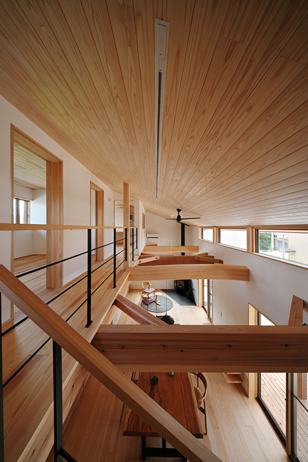 吹抜けに架かるのは、ご夫婦が希望された太鼓梁。木そのものの力強さと美しさを感じられます。