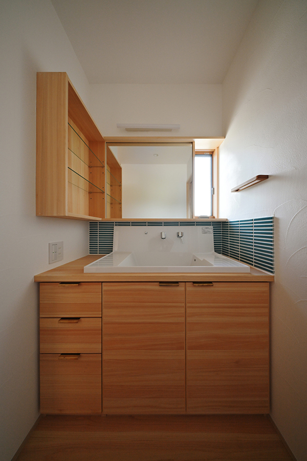 造作の洗面コーナー。アクセントになっているタイルは、名古屋モザイクのエリアボーダー彩。水返しのあるタカラの洗面ボウルで毎日気持ちよく使えます。