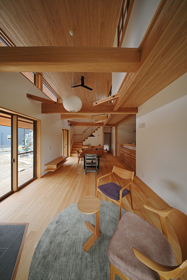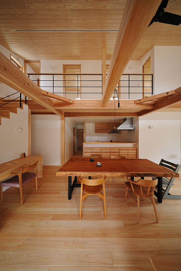 太鼓梁がかかり、のびやかな広がりを感じるリビングダイニング。梁を何本か渡すことで、大きな空間でもしっかりと強度を確保できます。