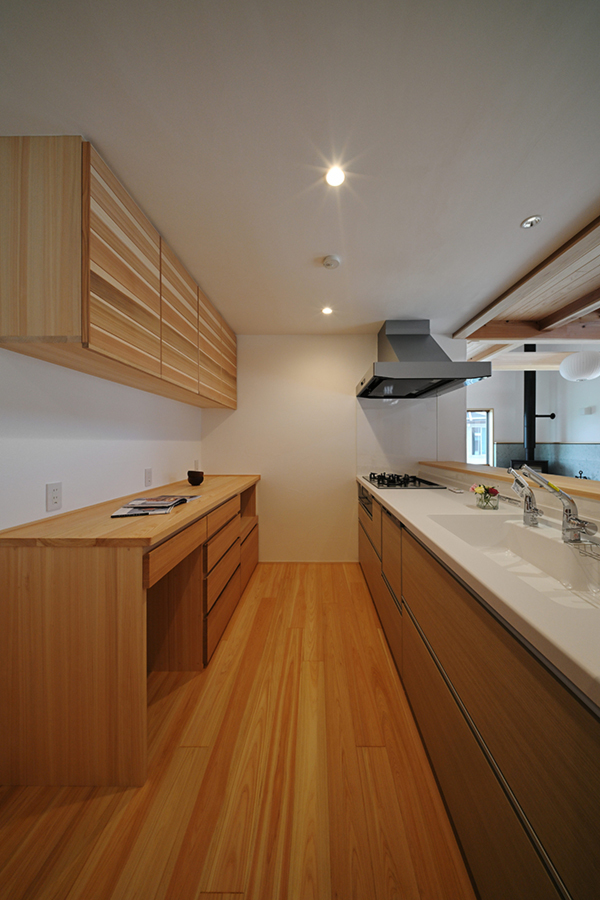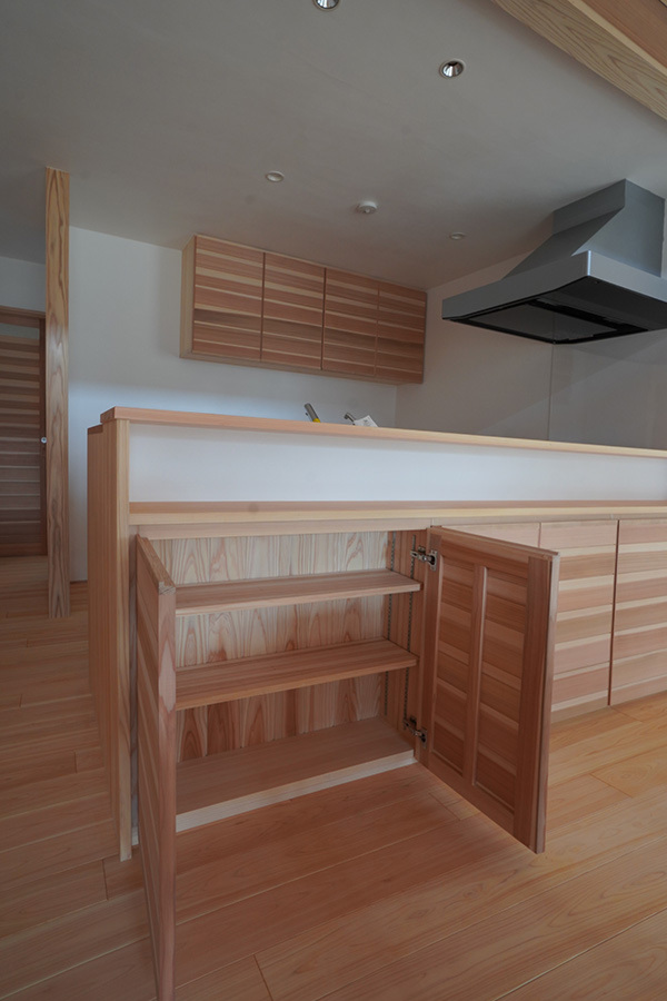 ヒノキのカウンター下は収納に。奥行きを浅めに設計することで、小物が整理しやすくすっきり暮らせます。
