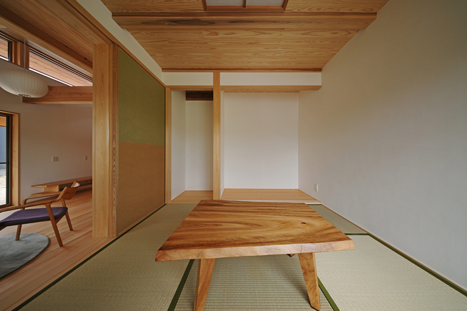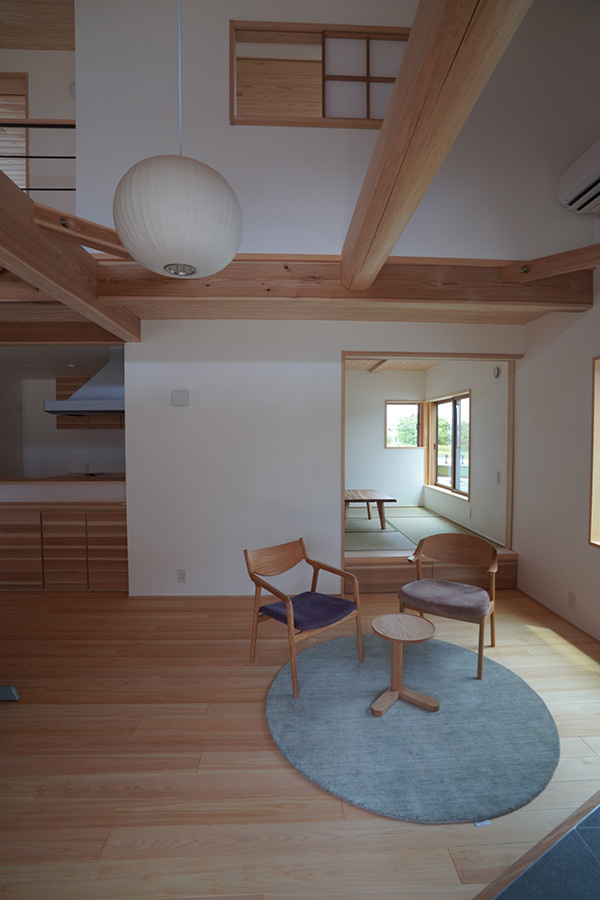 リビング-畳の間-二階の主寝室がほどよくつながる「つながり間取り」。家族の気配と、薪ストーブのあたたかさが家中にやさしく伝わります。