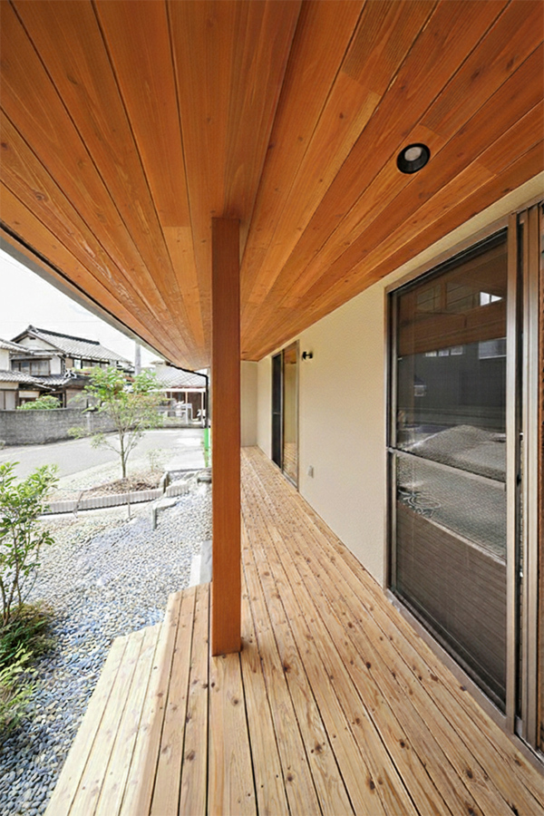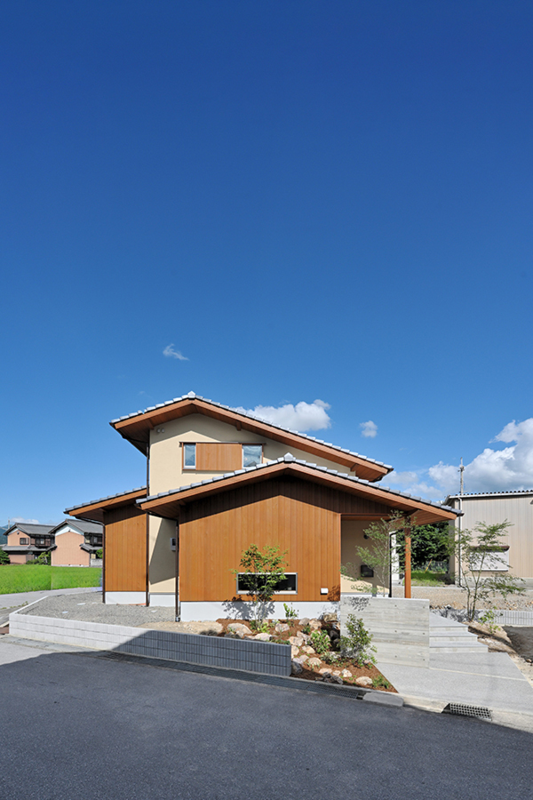 角地の特性を活かし建物を斜めに配置。自然の光や風、季節の景色が暮らしの中に入り込む住まいです。外壁は落ち着いた塗り壁と、杉の赤身を使った板張りを組み合わせました。