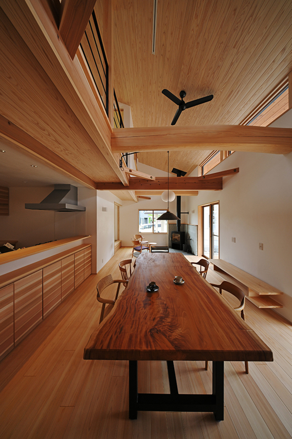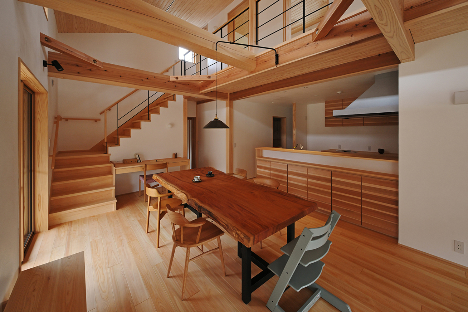 ダイニングテーブルは、ご夫婦が製材工場で選ばれた欅の一枚板。ゆったりと大きなテーブルに集う時間が生まれます。