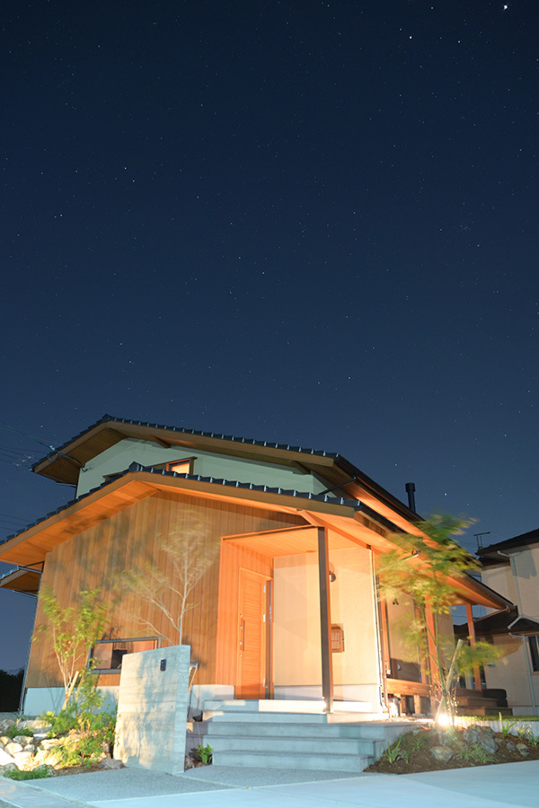 灯りに照らされた木の表情が美しい夜の外観。ライトアップや庭の外構まで含めてトータルでプランしています。