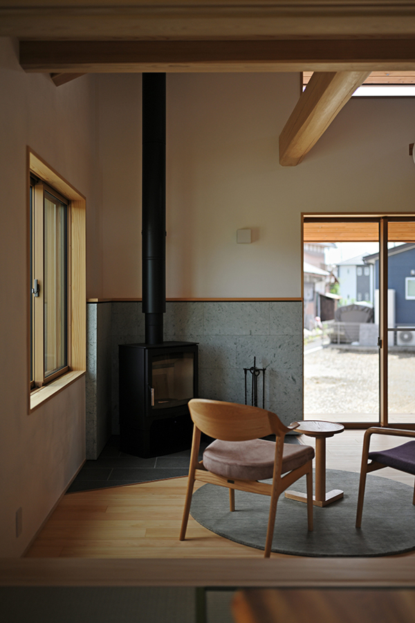 小上がりの畳の間からみる薪ストーブ。ストーブ背面の壁には十和田石を貼り、落ち着いた表情に仕上げました。薪ストーブはアスペクト8。