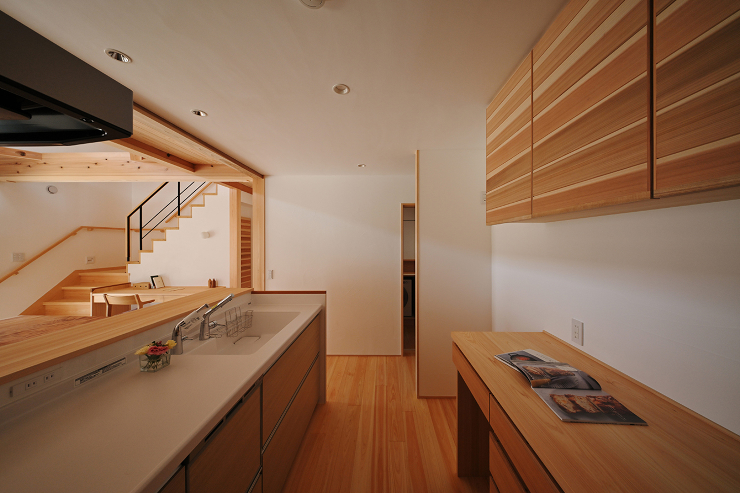 キッチン奥には、洗濯スペースとクローゼットを設計。家事がスムーズにつながる動線です。