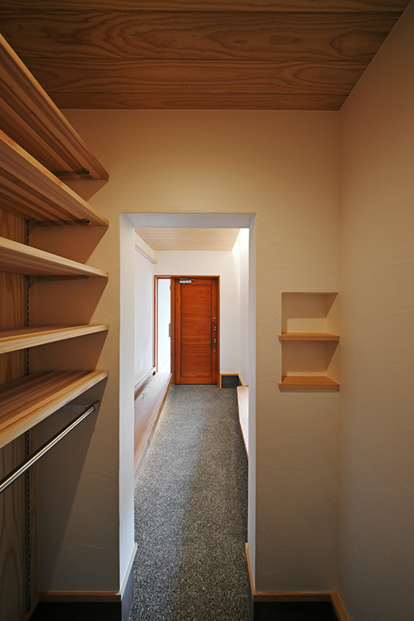 玄関から一直線につながる玄関収納。土間続きで、ベビーカーや外遊び用品の収納に加え、ご主人の趣味の水槽も置けます。