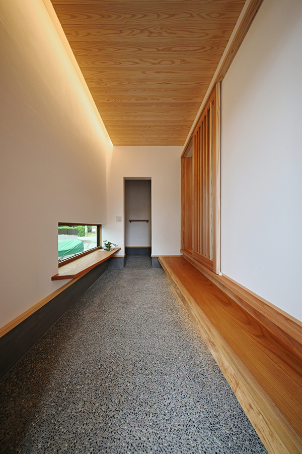 ゆったりと来客をお迎えできる玄関。緑の見える地窓にはベンチを設計し、腰をかけたり季節のしつらえを楽しんだりできます。式台は欅の一枚板を。