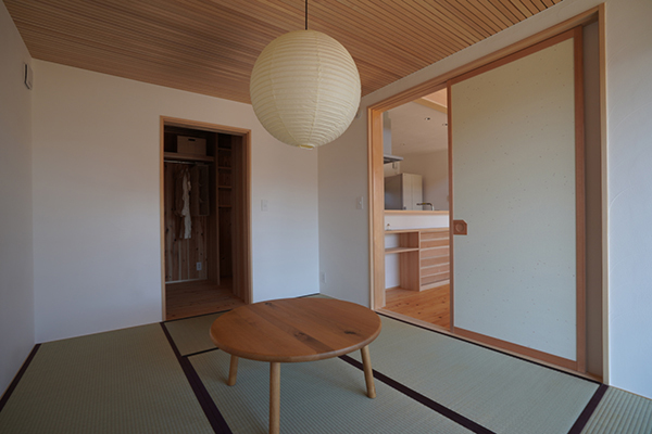 年を重ねても暮らしやすい1階和室の寝室。天井は杉小幅板の目透かし張り。