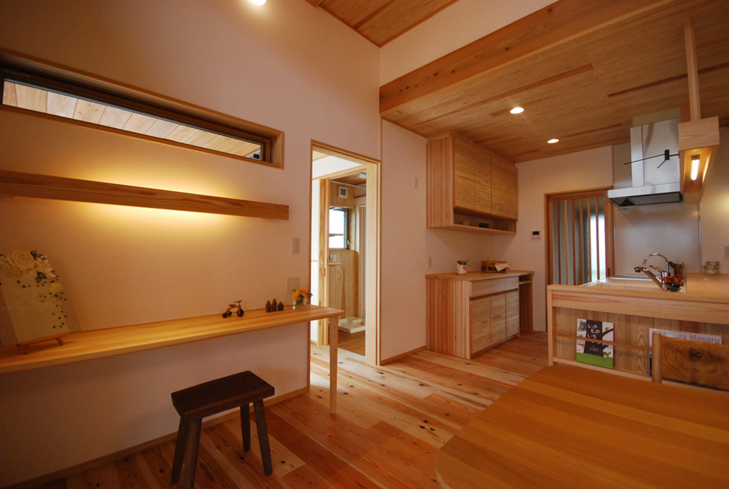 アイランドキッチン並みに低く抑えたカウンター、リビング内のスタディコーナーやひと繫がりの畳の間など、それぞれのことをしていても空間をともにできる住まい。洗面からの物干しテラスや、薪ストーブの土間つながり勝手口など使いやすい間取り。